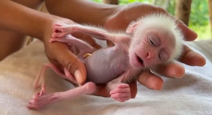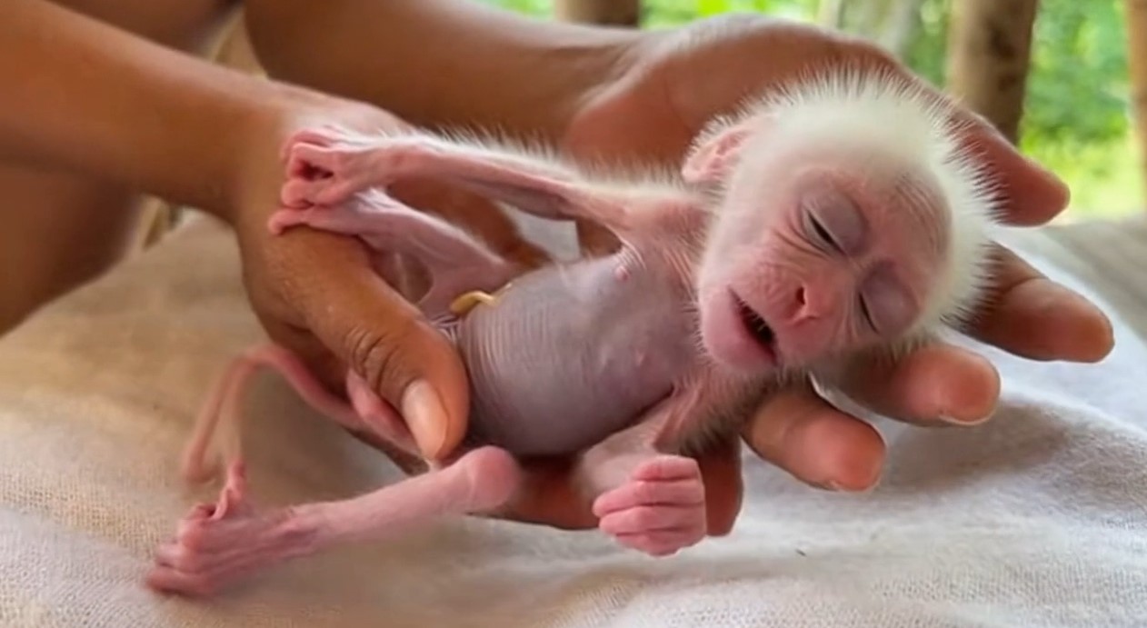 The newborn baby monkey was barely a few hours old when it was found. Its body was still weak, its eyes half-closed, and its tiny hands struggled to hold onto anything solid. There was no sign of its mother nearby. No warmth. No safety. Just silence and danger surrounding a life that had only just begun.